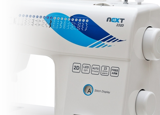 Minerva Next 232D оснащена нитевдевателем, регулятором натяжения верхней нити, встроенным шпуленамотчиком и съемной рукавной консолью. Для операций штопки и свободной вышивки нижний транспортер ткани может быть отключен при помощи штопательной пластины.